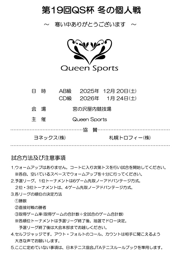 2025〜2026 第19回QS杯冬の個人戦AB級結果 投稿者: MitamuraMegumi2025年12月21日2025、2026、News & Topics、QS杯、大会情報 AB級予選リーグ結果 AB級トーナメント結果